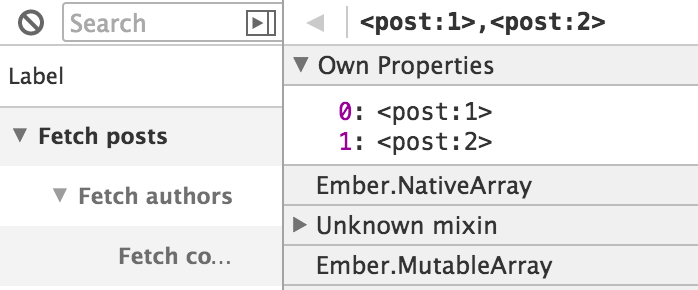 If the fulfillment value of a Promise is an Ember object or an array, you can click on that object to open it in the Object Inspector.